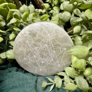 Base de Selenite com Círculo de Metatron ✨ Purifica, protege e eleva a energia do teu espaço. A selenite limpa, o Metatron equilibra e harmoniza.