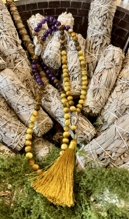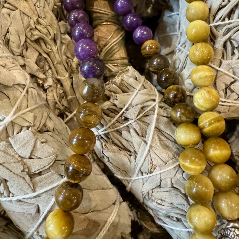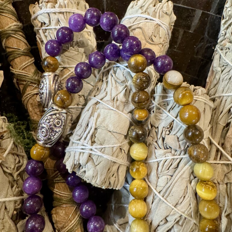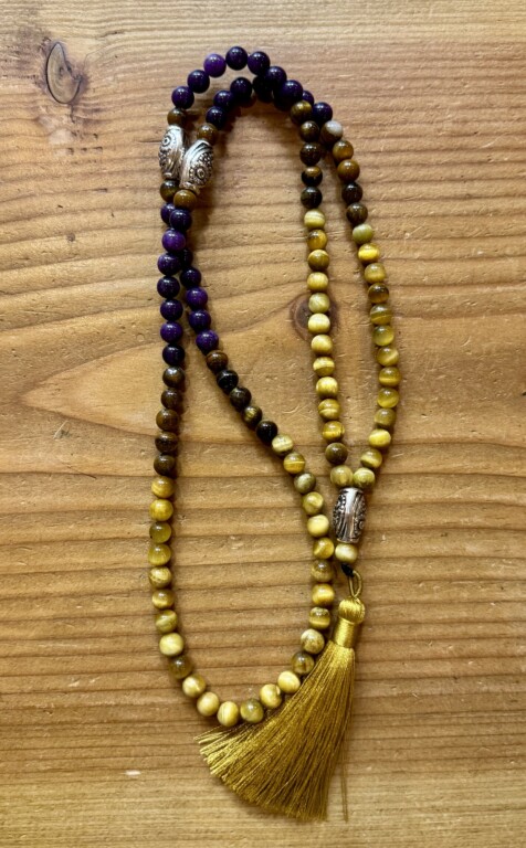 Este japamala une a profundidade da Ágata roxa com a energia protetora do Olho de Tigre amarelo e castanho 🐅